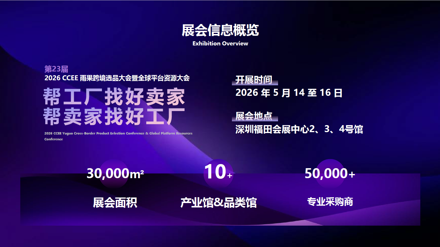 5月14日-16日,由雨果跨境主办的2026CCEE雨果跨境展暨全球平台资源大会将在深圳福田会展中心2、3、4号馆举行;CCEE全球风尚大赏爆品T台秀,帮工厂找好卖家,帮卖家找好工厂。