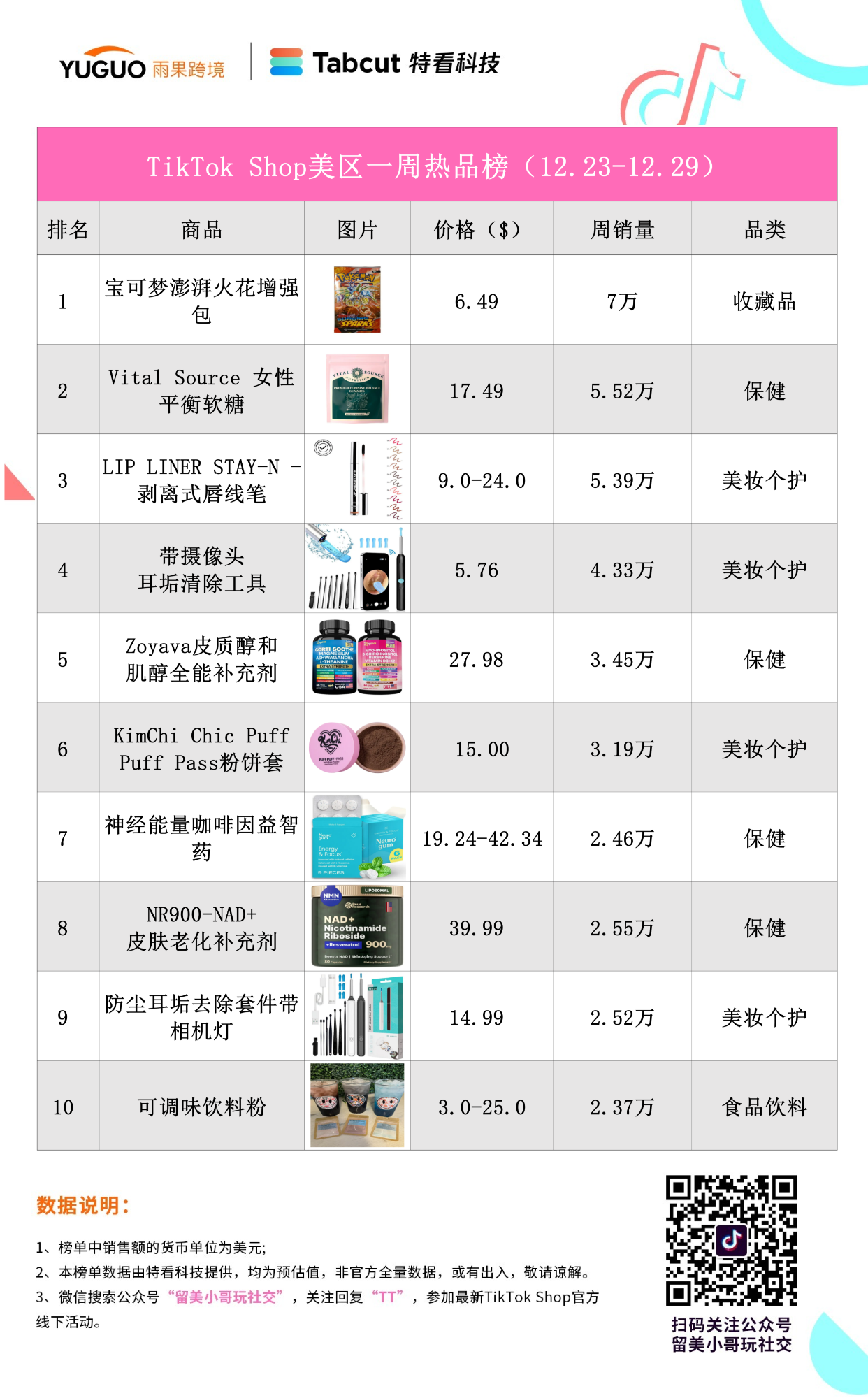 以下是本期(2024年12月23日—12月29日)TikTok Shop 美国站一周热品数据分析,榜单按销量排序,帮助卖家及时了解 TikTok Shop 美区最新市场现状,掌握选品趋势。